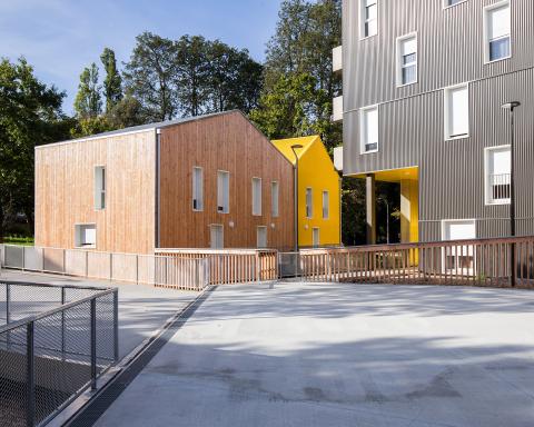 Le relais-parental est situé au RDC de l’EHPAD, favorisant la mutualisation des espaces et la vie intergénérationnelle de l’ilot. A ces équipements s’assemblent des volumes de logements pour lesquels le projet s’attache à offrir les mêmes qualités : les accès se font par des halls en sur-hauteur, la totalité des logements est en double-exposition, le nombre de logements au palier est limité, les angles de bâtiments ouvrent des vues dégagées vers le paysage.